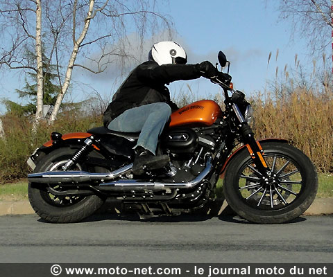 Cette relative compacité mécanique constitue le seul avantage du Sportster sur sa rivale en termes d'ergonomie, tant sa position de conduite n'est pas vraiment naturelle. Le guidon tend et lève légèrement les bras, suggérant de prime abord une posture typée "custom" : pieds en avant, bassin calé dans le fond de la selle et aisselles au frais...
