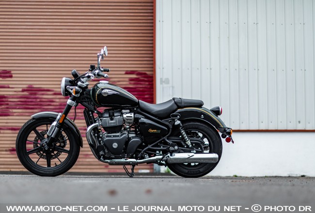 Cette mécanique aux ailettes bien visibles est accouplée à une boîte six vitesses et une transmission par chaîne, en charge de déplacer les "241 kg" annoncés avec 90% du plein (15,7 l d'essence dans son réservoir en goutte d'eau). Grande première sur une Enfield : la Super Meteor 650 est pourvue d'une fourche inversée de 43 mm !