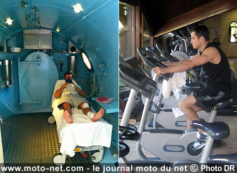 "L'intérêt de cette pratique est de réparer les tissus du corps à un rythme plus élevé grâce à un niveau de pression et d'oxygène plus important que dans l'air. J'ai pris la direction de Cannes ensuite pour poursuivre ma rééducation et y faire des séances d'ultrasons qui servent à consolider les os. Et j'ai enfin regagné mon domicile en Andorre lundi dernier où je continue également les ultrasons avec une machine domestique. J'ai donc finalement repris le sport en me rendant tous les jours à la salle de gym pour y faire du vélo et travailler plus particulièrement le haut du corps en faisant de la musculation avec des poids et des élastiques", explique Randy qui est passé de la cinquième à la huitième place au classement MotoGP durant son absence.