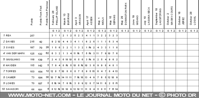 Tout comme Sykes, Lowes se fait déborder par ses poursuivants : VDM et De Angelis passent devant la R1 n°22.paradoxalement, la piste détrempée - toute neuve donc offrant un excellent grip - n'est pas la "Cup of tea" des pilotes britanniques !