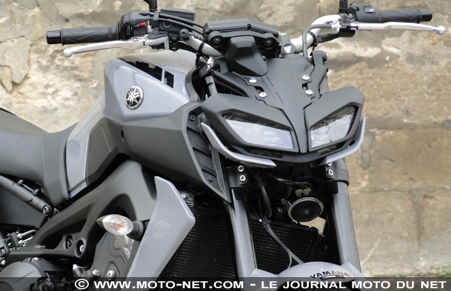 Avec son guidon haut, plat et large (52 cm entre les deux mains, 50 sur la Z et 46 sur la GSX-S), la MT-09 cultive son attitude de "Supermotard". La flexion des genoux est bien moindre que sur la Suzuki et la Kawasaki. C'est sur cette dernière que les jambes sont les plus pliées, même quand le conducteur se recule au maximum... L'achat d'une selle optionnelle haute sera à méditer pour les grands "gros-rouleurs".