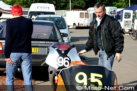 Encore une séance de mécanique lourde, qui fait suite au changement de joint de culasse réalisé à Carole (lire Moto-Net du 25 mai 2004). Je couche la moto sur le flanc et m'attelle à la tâche. Encore une fois, Régis du TTS me gratifie d'une superbe leçon de mécanique monoèsque et nous constatons ensemble que les clavettes sont en bon état. Grosse déception et inquiétude croissante, connaissant les deux autres causes probables. Manu Pintor (n°9) et Maïkeul Viravongsa (n°66) me dépannent d'une clavette neuve (tant qu'on y est) et d'une rondelle frein et je remonte le moteur, la mort dans l'âme. Seule consolation : la moto est à priori capable de rouler demain aux essais qualifs...