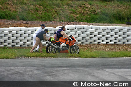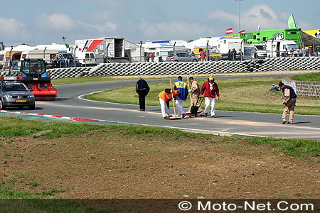Grosse montée de stress dans les rangs du Team Moto-Net en bord de piste lorsque les pompiers sortent la civière, suivie quelques très longues secondes plus tard par un énorme soulagement quand ils la ramènent à vide... Pascal marchant à leurs côtés !
