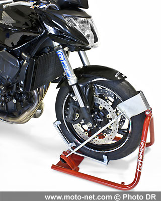 Le manufacturier italien FG Gubellini (suspensions, accessoires, boîtiers électroniques, etc.) propose une intéressante béquille qui permettrait de fixer une moto rapidement, en toute sécurité et surtout sans utiliser de sangles.
