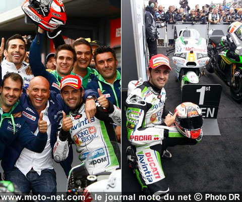 Conscient d'avoir bénéficié d'un petit coup de pouce circonstanciel, l'espagnol ne boude cependant pas son plaisir, non sans raison puisqu'il a réussi à garder un bon rythme sur une moto qu'il découvre, dans des conditions responsables de la chute de nombreux pilotes expérimentés.