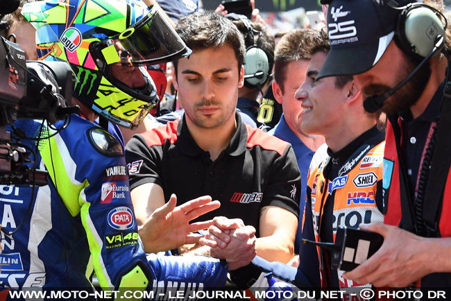 Plus indirectement, un autre hommage se trouve aussi dans la magnifique bataille que se sont livrée Rossi et Marquez pendant la course Moto GP, avec en point d'orgue une poignée de mains presque "historique" à l'issue de la course : les deux hommes ne s'étaient plus adressé la parole ni même jeté un regard depuis leur conflit de la fin de saison 2015, y compris sur le podium du GP d'Argentine lorsque Marquez avait trébuché sous les yeux de Rossi...