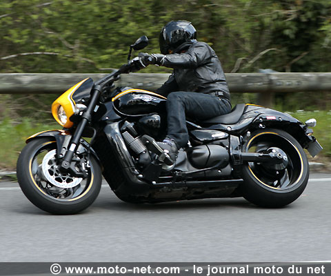 Capable de reprendre à 1500 tr/mn sur les trois premiers rapports (un poil plus en quatrième et en cinquième), l'énorme v-twin japonais est un modèle d'agrément : ses vibrations sont très contenues, son embrayage est doux et progressif, son injection est bien calibrée et il ne chauffe pas exagérément en ville. Et quelle sonorité !