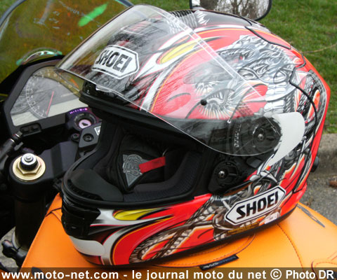 Remarquablement stable à haute vitesse - même en tournant la tête à plus de 200 km/h pour vérifier si le collège n'aurait pas l'intention de tenter un freinage ! -, l'intégral Shoei offre un champ de vision large et sans gêne d'aucune sorte, ainsi qu'un confort acoustique dans la bonne moyenne des casques racing.