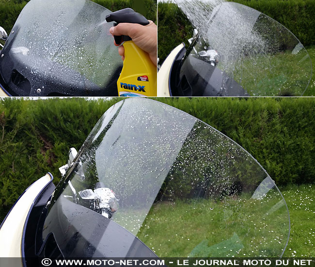 La marque Rain-X, propriété du groupe ITW basé à Houston (Etats-Unis), conçoit depuis plus de 40 ans différents produits facilitant l'évacuation de la buée et de la pluie sur les pare-brises auto et moto. Parmi eux, un déperlant plastique sous forme de pulvérisateur testé par MNC.