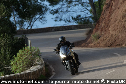 Remarquablement suspendue (la fourche télescopique de 41 mm, désormais réglable en précontrainte, adopte une compression plus libérée et une détente freinée), la douce Honda filtre les petites et moyennes imperfections du bitume avec la discrétion et l'efficacité d'un majordome anglais, même si le passage sur de plus grosses bosses finit par révéler les limites du monoamortisseur Pro-link.