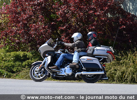 Souple, le "big bloc" reprend à 1500 tr/mn sur tous les régimes, voire à 1250 tr/mn sur les trois premiers rapports en solo. En duo chargé, il lui faut en revanche plus de régime sous peine de le faire hoqueter. Ajoutée à sa transmission longue, cette caractéristique contraint à jouer de l'embrayage en dessous de 30 km/h en 2ème pour manoeuvrer confortablement à deux. On peste aussi contre son point mort infernal à trouver, comme sur l'Electra Glide Ultra LTD.