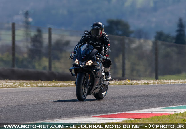 | Puces savantes. L'électronique comprend un antipatinage réglable sur 8 positions, un antiwheeling paramétrable sur 3 crans, un assistant au départ, un shifter bidirectionnel (montée et descente), un limiteur de vitesse pour la voie des stands, un régulateur de vitesse, un ABS Bosch sensible à l'angle et trois modes de conduite (Sport, Track et Race). Une centrale inertielle Magneti Marelli 7MS gère finement et progressivement cet arsenal selon la position de la moto. |