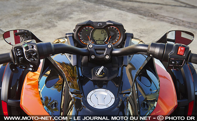 Avant de s'élancer, un coup d'oeil au tableau de bord confirme qu'il s'agit du même modèle que sur les Spyder précédents. D'inspiration automobile, il s'articule autour de deux cadrans à aiguille indiquant la vitesse et le régime moteur ainsi qu'une fenêtre digitale où défilent - via le commodo gauche - des informations comme la température de l'air, le rapport engagé et deux trips (liste complète dans notre fiche technique en page 3).