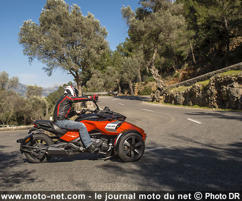 Les Spyder virant à plat - comme un quad - la conduite reste uniquement dévolue aux bras, contrairement à une moto sur laquelle on se sert de pratiquement tout son corps pour virer en contrebraquant. D'où une certaine tonicité musculaire exigée durant les manoeuvres, ou lorsque le rythme s'accélère !