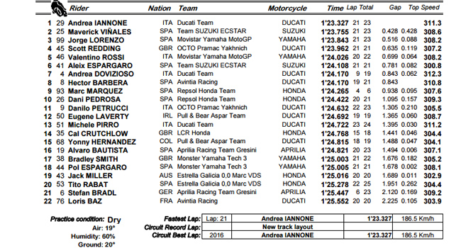 Troisième, Maverick Viñales parvient toutefois à réduire l'écart à 4 dixièmes (contre 0,8 sec hier), tandis que Jorge Lorenzo revient à une demi-seconde. L'officiel Suzuki explique sa performance par les progrès enregistrés sur la GSX-RR, notamment l'introduction de nouveaux ailerons ce week-end qui rendent la moto plus précise à haute vitesse et réduisent sa tendance aux wheelings. Ainsi, il est possible d'utiliser plus de puissance en sortie de courbe, car l'intervention de l'électronique est repoussée.