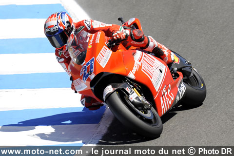 Donnant pour tout pour revenir sur son rival ibérique, Valentino Rossi commence à distancer Casey Stoner : petit à petit, l'aussie perd du terrain et se retrouve sous la menace de Jorge Lorenzo. Le n°99 ne perd pas une seconde et dépasse une Ducati hésitante sur les prises de freins...
