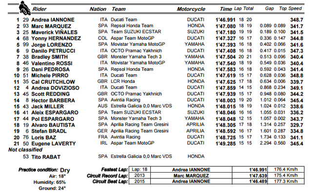 Le champion du monde en titre, Jorge Lorenzo, hisse sa Yamaha à la cinquième place, toujours en manque de quelques dixièmes pour briguer la tête du classement. Relégué à 0,4 sec, le futur pilote Ducati précède Petrucci, Smith et Rossi, huitième à 0,549 sec.