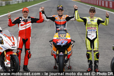 Les accros aux statistiques noteront d'ailleurs avec intérêt que Stoner (en photo ci-contre avec Bradl et Terol) a marqué plus de points en 2007 avec Ducati (367) que cette année avec Honda (350), à qui il offre son premier et unique titre en 800 cc.