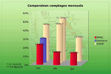 Via ses antennes départementales, la FFMC a procédé à ses propres comptages, dont un "échantillon représentatif de 10%" a même été validé par huissier" : avec 230 comptages portant sur 137 296 véhicules dans 38 départements répartis sur 18 régions, par beau temps et par mauvais temps, hors pluie et brouillard conformément aux conditions "officielles" de la DSCR, le taux d'allumage des feux le jour sans que les conditions météo ne l'exigent n'a cessé de baisser, passant de 23,47% en novembre à 8,23% aujourd'hui.