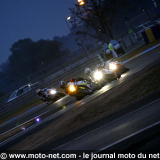 Nouvelle chute de la Honda n°55 de National Moto qui rentre au stand au ralenti avec Diego Lozano aux commandes à 23h03. Motivés par leur retour sur la tête de course, les pilotes Honda France continuent à cravacher pour tenter de combler l'écart les séparant du SERT(2ème) et du YART (1er) : Charpentier, Lagrive et Plater parviendront-ils à relever ce défi, alors que la nuit s'est définitivement installée sur le Bugatti ?