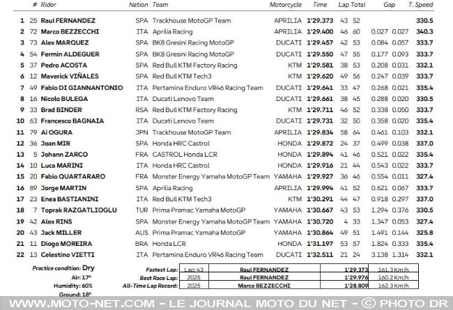 A noter l'intéressant 8ème temps de Nicolo Bulega, qui remplace Marc Marquez pour la dernière fois sur la Ducati officielle. Le pilote WSBK est le quatrième pilote Ducati du classement derrière les deux Gresini d'Alex Marquez (3ème) et Fermin Aldeguer (4ème) et la Desmosedici 2025 de Fabio Di Giannantonio (7ème).