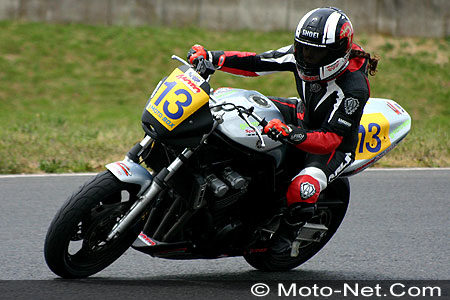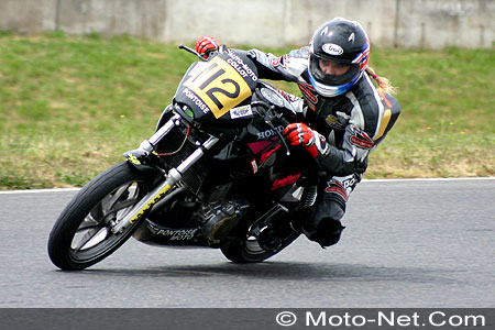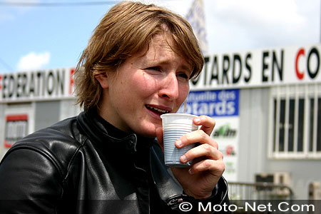 Elle relègue ainsi à près de deux secondes les deux autres pointures, Evelyne Roques, ancienne gagnante du Trophée féminin en 1993 (Honda 600 Hornet n°95, 1'12.582), et Magalï Langlois (Yamaha 600 Fazer n°67, 1'12.831), 26ème scratch au Mans cette année (lire Moto-Net des 3 et 4 avril 2004) et qui prendra le départ du Bol d'Or au guidon d'une Yamaha R1 2004 (lire Moto-Net du 26 avril 2004).