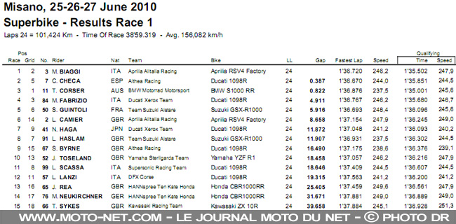 Max Biaggi s'envole donc au classement provisoire des pilotes : le pilote italien totalise 307 points, soit 37 de plus que Leon Haslam ! Carlos Checa (172 pts) pique à Jonathan Rea (158) sa 3ème position. Haga conserve sa 5ème place mais voit remonter sur lui Corser et Fabrizio. Guintoli est aux portes du Top 10 avec 116 points.