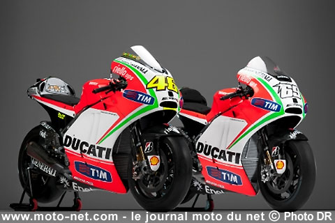 Suivie en direct sur Facebook par près de 100 000 fans (lire MNC du 12 mars 2012), cette présentation vidéo a permis de découvrir la nouvelle livrée des Ducati GP12 frappées des n°46 et 69 : au traditionnel bi-tons rouge et blanc vient s'ajouter une pincée de vert, soit les mêmes coloris que sur le drapeau italien et sur la 1199 Panigale Tricolore (lire notre Essai de la Panigale en Full).