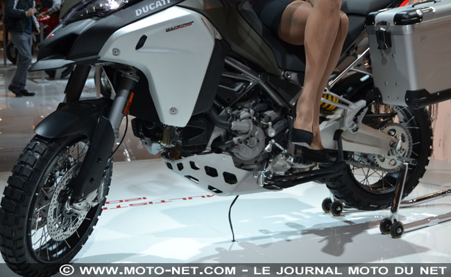 Le "bec" caractéristique des Multistrada est rallongé afin d'accentuer le côté trail de la moto. Par ailleurs, les garde-boue sont redessinés pour une meilleure protection tandis qu'une béquille centrale est installée de série. Une bonne nouvelle dans la mesure où la transmission finale se fait toujours par chaîne ! A noter que l'élégant mono-bras est remplacé par un élément à deux montants, retenu pour réduire le poids et sa capacité à "mieux absorber les chocs en tout-terrain".