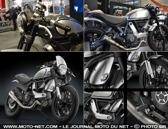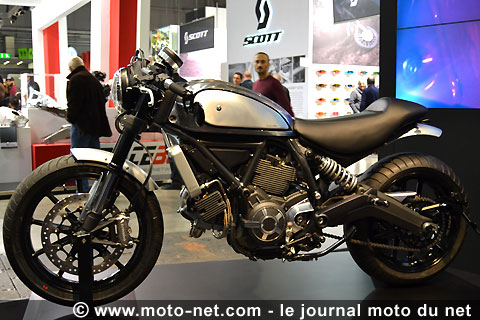 Le manufacturier italien Rizoma expose au salon de la moto EICMA de Milan une très belle version "café-racerisée" de la Ducati Scrambler, totalement équipée avec les pièces et accessoires développés pour la néo-rétro italienne. Du travail soigné et valorisant pour un total dépassant les 5000 € !