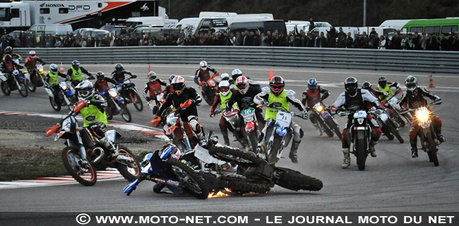Les tétines ne sont pas faites pour le bitume et une poignée de pilotes s'emmêlent dans un carambolage emportant Marc Germain et toutes ses chances de devancer Adrien Chareyre au classement final, malgré une remontée spectaculaire (il terminera 7ème)... Mickael Pichon est en tête suivi de près par un Sylvain Bidart déchaîné, tandis que Régis Laconi chute mais repart pour terminer 21ème !