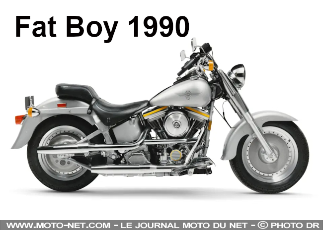 Lancée en 1990, la Fat Boy s'inspirait de l'Hydra-Glide de 1949 et d'une préparation réalisée en 1987 par un concessionnaire québécois, Duc Dufour. Elle expose des éléments stylistiques forts : jantes pleines, gros pneus, phare chromé, silencieux superposés. Sa popularité grimpe en flèche l'année suivante grâce à son passage remarqué dans Terminator 2, aux mains (musclées) d'Arnold Schwarzenegger.