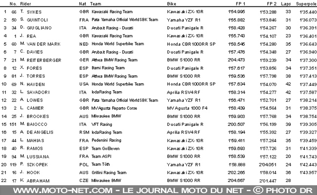 Moins proche de Sykes qu'à Aragon il y a deux semaines en termes de chrono, Sylvain Guintoli postera néanmoins sa Yamaha R1 officielle sur la deuxième place de la grille cet après midi et demain. Le Frenchie devance Davide Giugliano et sa Ducati d'usine.