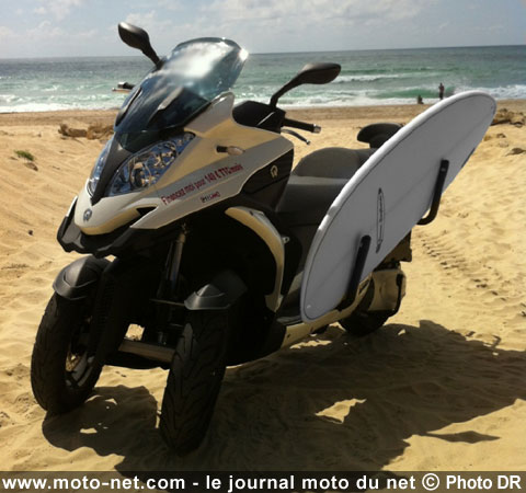 L'arrivée de l'été en France (enfin, surtout dans le sud...) a inspiré une préparation peu banale aux Bordelais de la concession Pitlane : ce concessionnaire Aprilia, Keeway, Norton et Quadro a décidé de faire d'un scooter à trois-roues Quadro 350D le nouveau meilleur ami des surfeurs (lire notamment MNC du 14 octobre 2010 et MNC du 10 janvier 2012)...