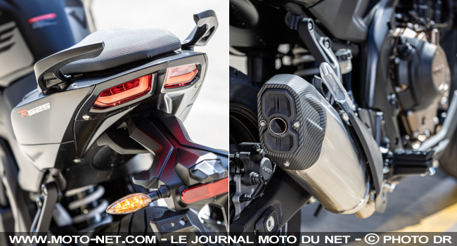 Son châssis tubulaire acier s'associe à des suspensions Kayaba relativement basiques, comme le révèle l'absence de réglables sur sa fourche inversée de 41 mm et l'accès à la précharge seulement sur le monoamortisseur. Idem pour ses étriers "classiques" en position axiale (mais signés Nissin). Contreparties logiques d'un prix agressif : la R625 débarque à 5795 euros !