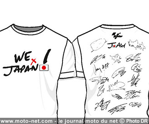 Signés par les 17 pilotes de la catégorie Moto GP, ces t-shirts arborant la mention "We x Japan" ("Nous sommes avec le Japon") seront vendus 20 € sur plusieurs circuits du calendrier du championnat Moto GP 2011, ainsi que sur le site weforjapan.com.