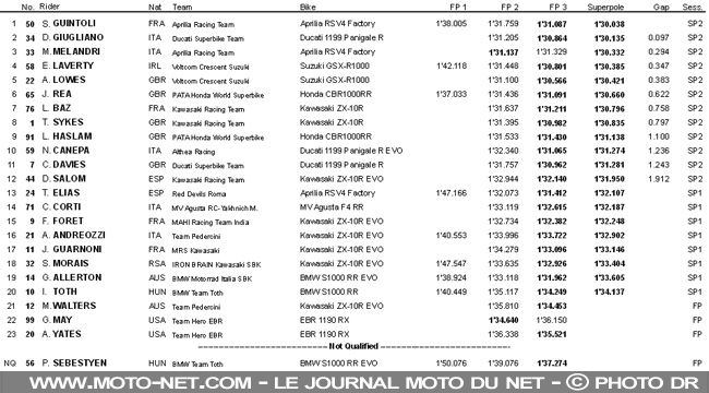 Leon Haslam partira finalement de la 9ème place pour les deux manches programmées demain (à 2h et 4h30 pour les plus courageux des fans français !). Suivent au quatrième rang Niccolo Canepa, Chaz Davies - qui s'est fait une belle frayeur dans la ligne droite des stands - et David Salom.