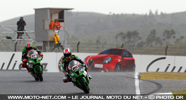 Totalement inattendue, la pluie a pimenté une première manche Superbike à Portimao qui ne manquait déjà pas de piquant... Victime d'un souci technique, Sykes n'a pu disputer la victoire à Rea jusqu'à la fin. Davies complète le podium. Première course Superbike Tom Sykes fait le holeshot aux commandes de sa Ninja n°66 devant Davide…
