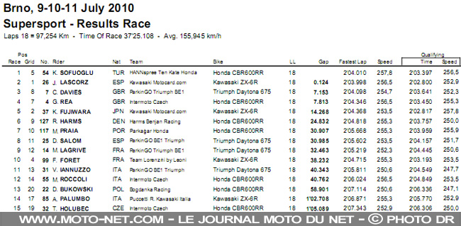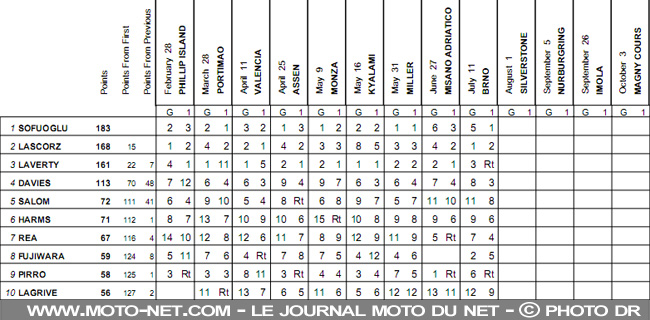 En raison du résultat blanc d'Eugene Laverty (Parkalgar Honda), Sofuoglu mène désormais le championnat avec 183 points devant Lascorz 168 et Laverty 161.