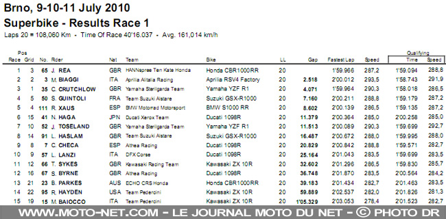 Un peu plus tôt dans l'après-midi pour la première course Superbike, c'est Jonathan Rea (Hannspree Ten Kate Honda), parti troisième sur la grille, qui s'était imposé avec 2,5 secondes d'avance sur Max Biaggi (Aprilia Alitalia) et le poleman Cal Crutchlow (Yamaha Sterilgarda).