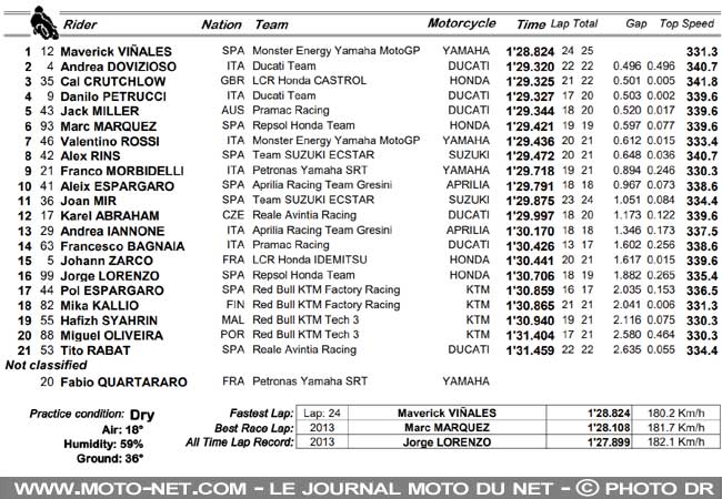 L'espagnol - qui a remporté ici même sa seule victoire la saison précédente - se montre très incisif sur sa Yamaha officielle : "Mack" a enchaîné les tours rapides, seul, et termine cette journée avec presque une demi-seconde d'avance (+ 0,496 sec) sur son premier poursuivant, Andrea Dovizioso.