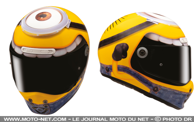 HJC lance une nouvelle édition spéciale exploitant l'univers des Minions : le casque V10 Stuart Minions, disponible du XS au XXL au prix de 399,90 euros. Cet intégral en fibres, lancé en 2013, présente un look classique destiné à séduire les motards Vintage.