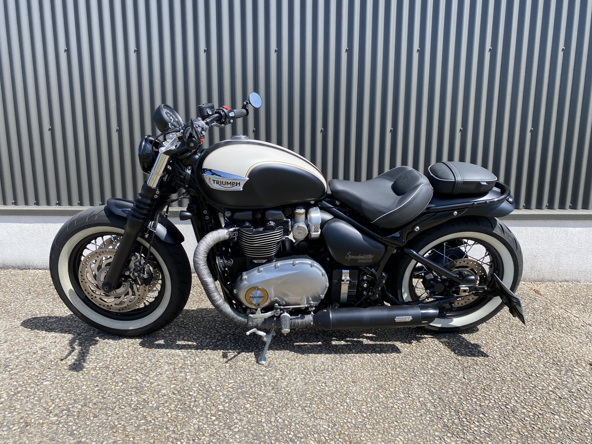 Moto d'occasion : Triumph Speed master 1200 de fevrier 2018 9571 kms moto équipée du guidon et repose pieds de la bobber, rétroviseurs embout de guidon, selle pilote et passager confort, silencieux vance &hines, garde boue court, support de plaque, clignotants a leds. ,Garantie 12 mois