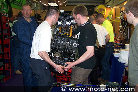 Après avoir déposé le moteur puis remplacé embrayage, roue, chaîne et boîte, les mécaniciens remontent tout pour tenter de repartir ! "On est là pour faire de l'endurance, pour aller au bout, pour finir !", prévient Stephane Millochay, le team manager particulièrement motivé.