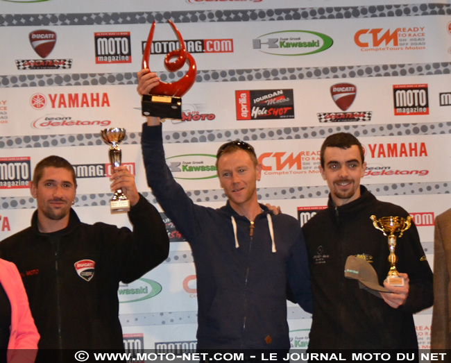 En Vétérans, Franck Coudert s'impose devant Patrick Cosnuau (Yamaha MT09) et Marc Troussard (Yamaha MT09). Dommage qu'une petite baisse de forme m'ait empêché d'exploiter au maximum le matériel au top dont je dispose... Le Bridgestone S20 Evo me plaît bien et pour ces premiers kilomètres je ne trouve rien à redire en termes de stabilité, de confort et de précision. J'ai hâte de l'essayer sur route mouillée !