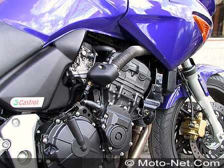 Autoroute A1, direction Compiègne. Le moteur pousse de façon linéaire avec une sonorité discrète mais agréable. Pas la peine de chercher un second souffle rageur dans les hauts régimes, car en ramenant la puissance à 77 chevaux (au lieu des 96 du Hornet), les techniciens Honda on bien aplati la courbe de couple et la puissance arrive progressivement jusqu'au régime maxi. Mais cette façon de délivrer des performances sans esbroufe, comme une main invisible qui vous pousse dans le dos, est justement un trait de caractère du 4-cylindres qui a son charme, tout à l'opposé de la "patate" du twin.
