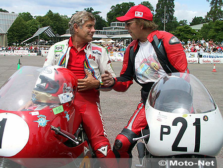 Giacomo Agostini et Phil Read ont renfilé leur combi ce week-end à l'occasion du Motorcycle World, organisé par le richissime lord Montagu dans son domaine du sud de l'Angleterre. Ou quand les bikers côtoient les aristos dans les effluves de méthane...