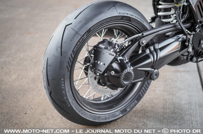 "Toutes les pièces métalliques d'origine ont été revêtues de poudre noire", explique le préparateur d'outre-rhin, qui a également installé des pneus au fort potentiel : des Pirelli Diablo Super Corsa. En définitive, il ne lui manque que des suspensions "Racing" pour en faire une moto qu'on M…