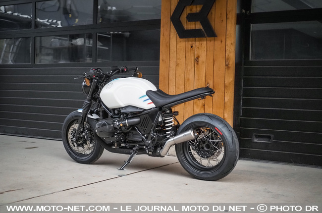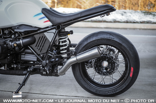 Sa touche Racing se renforce par un allègement de sa partie arrière : Classicbike Raisch a démonté la boucle - prévue à cet effet par BMW - pour la remplacer par un support tubulaire fait main. L'ensemble s'accompagne de feu multifonctions Motogadget "3-en-1", qui assurent à la fois l'éclairage, les clignotants et les feux stop. Un support de plaque déporté prend place sur le monobras oscillant où se trouve le cardan, côté droit.