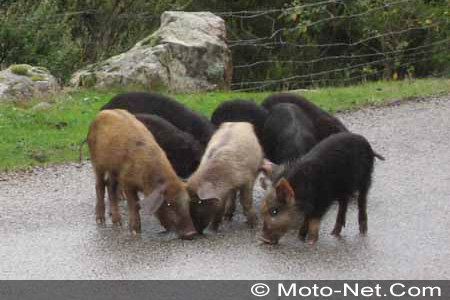 C'est au moment de repartir vers la montagne que le pluie se met à tomber pour de bon. A petite allure, nous remontons vers Evisa en serpentant sous l'averse. La montée fournit l'occasion de découvrir deux obstacles naturels supplémentaires : les bogues de châtaignes tombées sur le bitume - vraiment très glissantes sur le mouillé ! -, ainsi que les cochons sauvages, curieux croisement de sangliers et de cochons retournés à l'état sauvage.